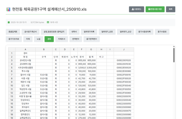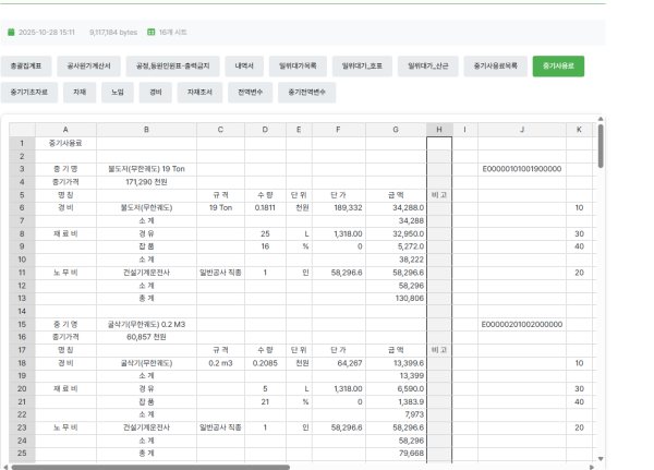 장비에 대한 코드로서 앞서 말한바와 같이 중기 손료에 따라 산출된 해당중기의 사용료를 구분짓기 위해서는 장비코드와 사용료 코드가 같이 사용된다. 그장비는 어떤중이게 조합되는 장비의 경우(대형브레이커와 같은 경우) 노무비(기계조작반원들의 노무비)는 제외되게 때문에 그 적용기준은 달라진다 중기사용료는 매해마다 적정중기손료를 발표하게 되는데 대동소이한 기준을 가지나 대다수 신규장비의 등록등을 포함한다